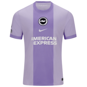 La camiseta visitante del Brighton para la temporada 2025/26 presenta un elegante diseño en doble tono de púrpura, con una franja central más oscura flanqueada por paneles y mangas en un tono lila más claro. Por primera vez se presenta con escudo del club y logo de Nike centrados en el pecho, con el símbolo de Nike situado bajo el escudo, rompiendo con las convenciones habituales, El cuello redondo y los puños ligeramente más anchos le dan un aire renovado, mientras los laterales lucen discretos detalles que realzan su estética sin recargar el diseño . La parte trasera mantiene una estética limpia en el tono claro, equilibrando la presencia visual de la parte frontal .