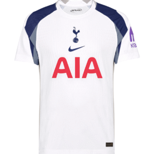 La camiseta de la primera equipación del Tottenham Hotspur para la temporada 2025/26, diseñada por Nike, presenta un diseño renovado que mantiene la esencia del club. El color blanco característico del equipo se combina con detalles en gris claro y azul marino, creando un contraste elegante y moderno. Una característica destacada es la colocación central del escudo del club y el logotipo de Nike, una novedad que no se veía desde la temporada 1984/85 .