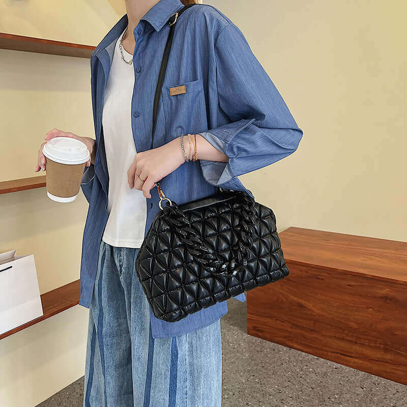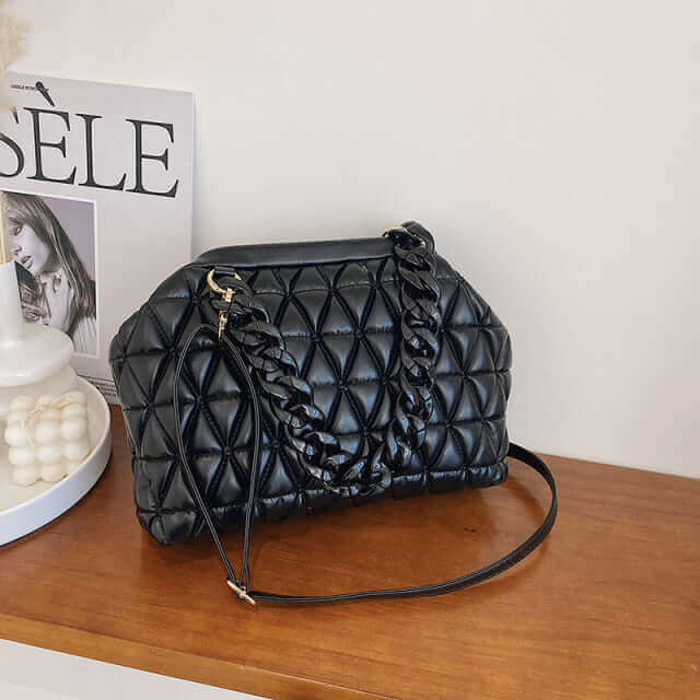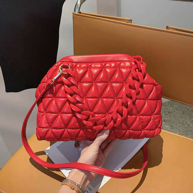 ¡Presentamos el bolso Thick Chain! Este precioso bolso es perfecto para cualquier mujer que ama el estilo y la sofisticación. El asa de cadena gruesa es a la vez moderno y práctico, y el bolso de hombro de diseño enrejado es perfecto para llevar todos tus elementos esenciales. El bolso cruzado tipo clutch es ideal para salidas nocturnas u ocasiones especiales, y el cinturón largo facilita ajustar la longitud según sus necesidades. Con su diseño elegante y su espacioso interior, el bolso de cadena gruesa es imprescindible para cualquier mujer conocedora de la moda.